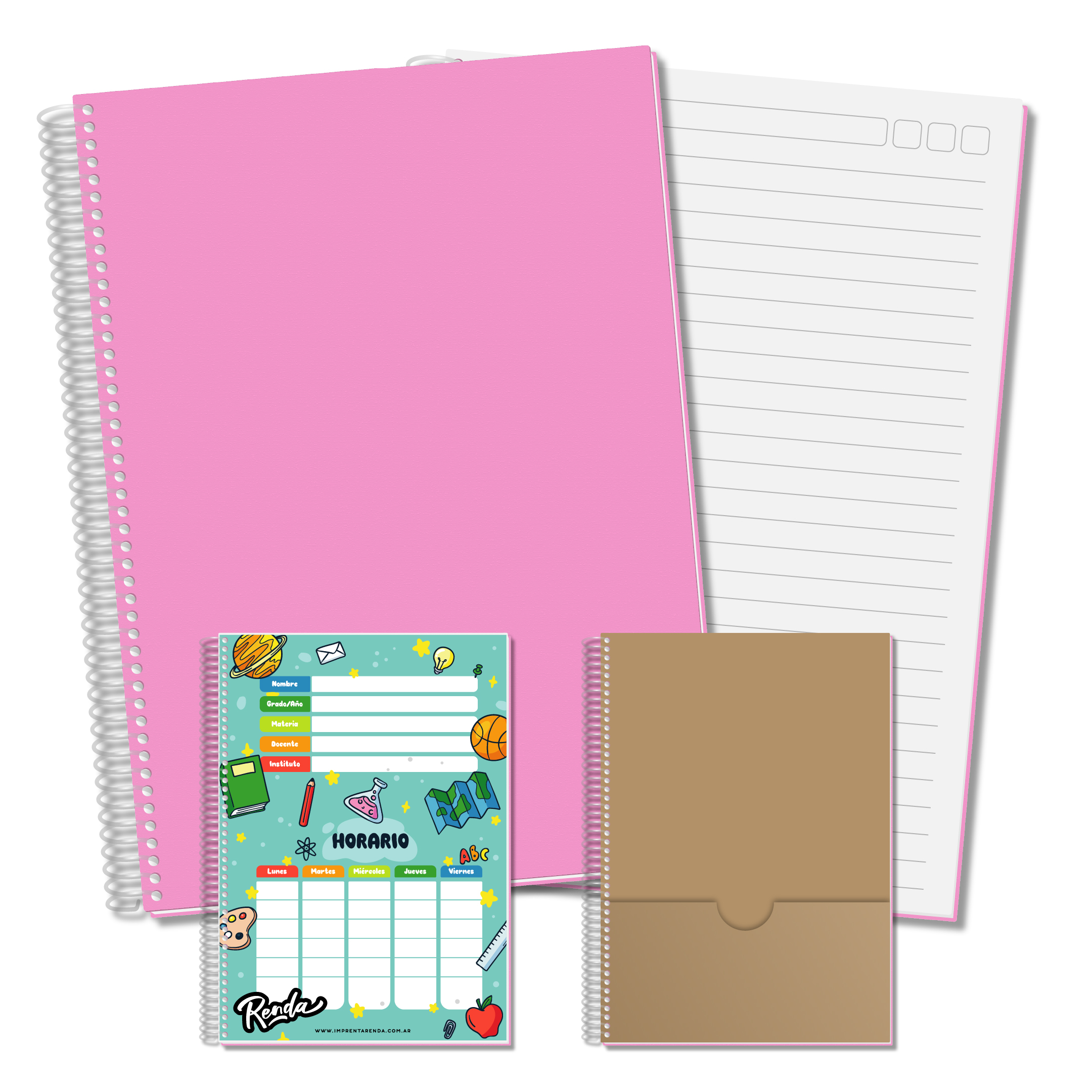 La encuadernación en espiral permite abrirlo completamente y doblarlo para escribir cómodamente en cada página. Incluye horario escolar con sector para nombre y datos del alumno, y un práctico sobre doble para guardar hojas sueltas o tareas.