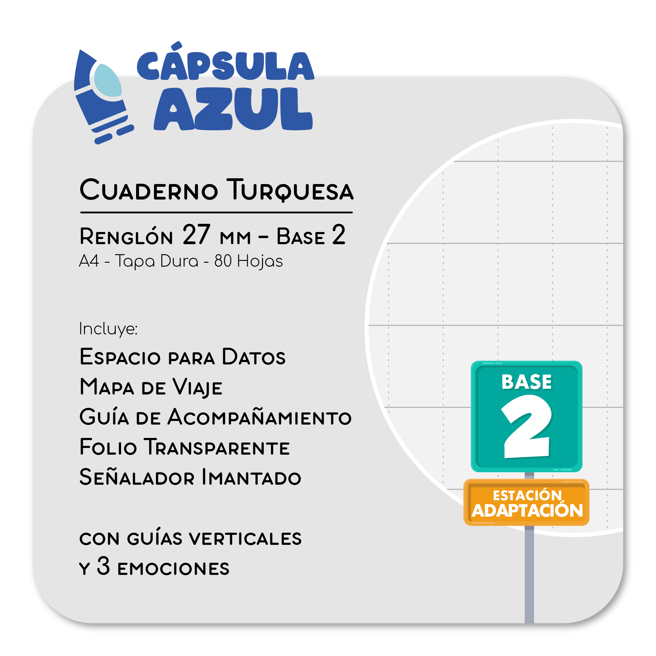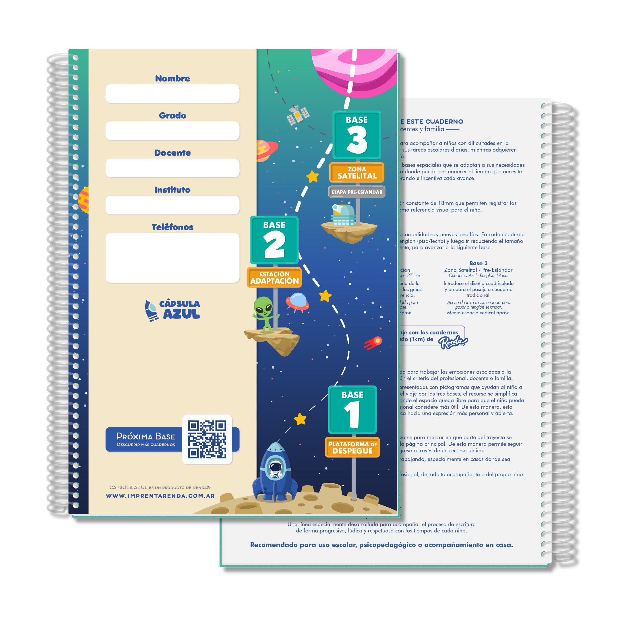 Cápsula Azul es una serie de cuadernos con renglones progresivos, especialmente desarrollada por Renda para acompañar a niños que presentan dificultades en la escritura, brindándoles un espacio donde puedan realizar sus tareas escolares de forma más cómoda y ordenada, mientras mejoran su escritura de manera gradual, respetando los tiempos de cada niño.